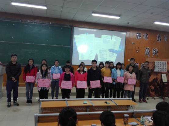 12月5日晚,大赛颁奖仪式于学院楼3501教室举行。学院党委副书记田伟、学院团委副书记杨洋、学院就业指导中心指导老师徐黎明、各班级学生代表,共300余人参加。仪式由就业指导中心工作人员周玉馨主持。活动伊始,2015级人文班田新同学带来的口琴演奏《茉莉花》拉开了颁奖典礼的帷幕。典礼上,主持人宣读各小组赛获奖名单;老师为获奖者颁发证书;田伟讲话,肯定本次大赛的意义,鼓励同学们多参加课余活动丰富文化生活,以促进自身全面协调发展;各小组赛一等奖获得者上台进行作品展示和介绍。