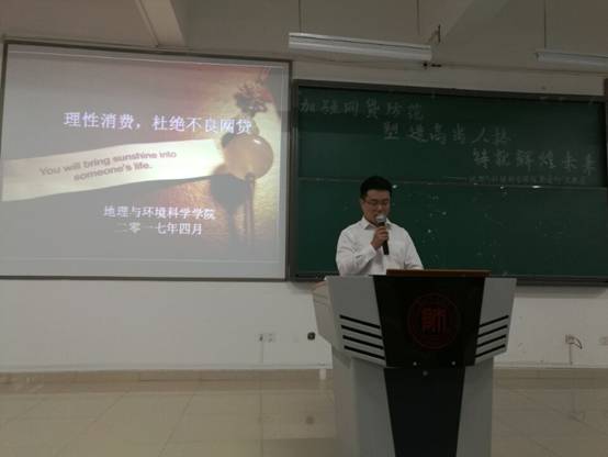 首先,程鹏以“理性消费、拒绝校园网贷”为主题向同学们普及了校园网贷常识与陷阱,并就学生的校园网贷调查情况对同学们进行了提醒。他指出,许多同学对网贷的黑幕不了解:网贷对借款学生的经济水平要求低,但利息相当高,学生一旦进行贷款,将无法还清贷款甚至引发其他问题。随后,程鹏以新闻报道及身边的典型案例来说明校园网贷的极大危害,并指出学生自身安全防范意识、规避风险能力低和对物质的过度追求是造成校园网贷悲剧的根源,许多兼职、刷单平台都是陷阱,防范意识薄弱的学生很容易落入圈套,提醒各位同学务必提高警惕。