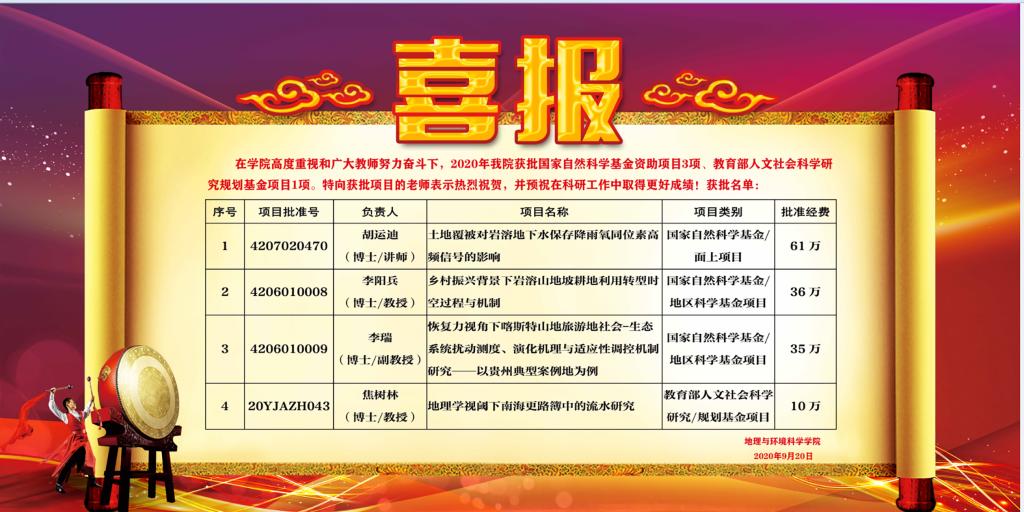 近日,2020年国家自然科学基金评审结果揭晓,威尼斯官网胡运迪、李阳兵、李瑞3位老师获批,资助金额共计132万元。此外,焦树林老师获批2020年教育部人文社科研究规划基金项目。
