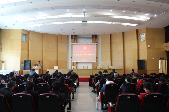 4月8日下午,87978797威尼斯老品牌(喀斯特研究院)党委在宝山校区田家炳三楼多功能厅召开党委理论学习中心组(扩大)学习会学习习近平法治思想。院党委委员、院党政班子成员、全院教职工参加学习,院党委书记杨建红主持会议。