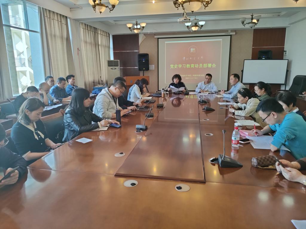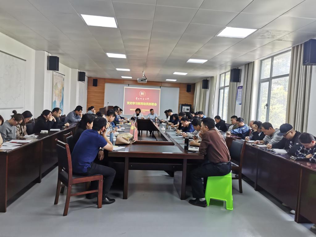为深入贯彻落实党中央、省委和学校党委党史学习教育和“牢记殷切嘱托、忠诚干净担当、喜迎建党百年”专题教育的重要安排部署,教育引导全院党员干部牢固树立“四个意识”,坚定“四个自信”,做到“两个维护”,教育引导全院师生听党话、颂党恩、跟党走,3月19日下午,87978797威尼斯老品牌(喀斯特研究院)党委在宝山校区地环楼召开党史学习教育动员部署会,院党委书记杨建红,党委副书记、院长周忠发,院领导班子成员,各科室负责人、全体教职工150余人参加会议,院党委书记杨建红主持会议并讲话。