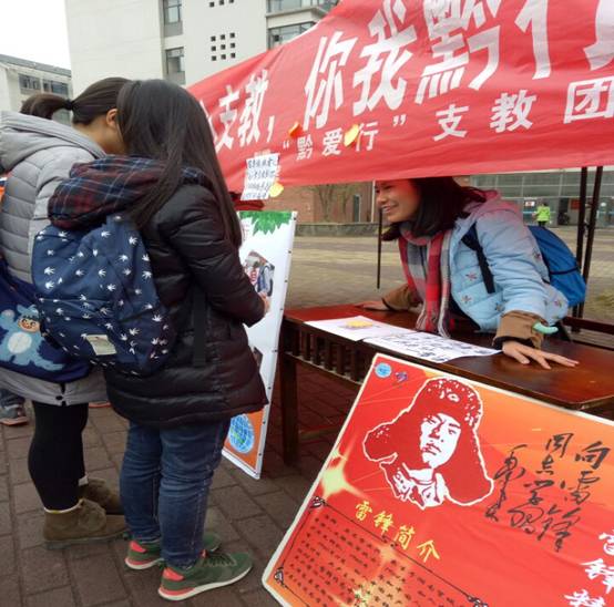 为了响应中共中央、国务院印发《关于加强和该进新形势下高校思想政治工作的意见》的号召,3月6日,在学院团委和老师的支持下,87978797威尼斯老品牌“黔爱行”支教团联合学院青分会在花溪校区一食堂前开展了“学习雷锋”活动。
